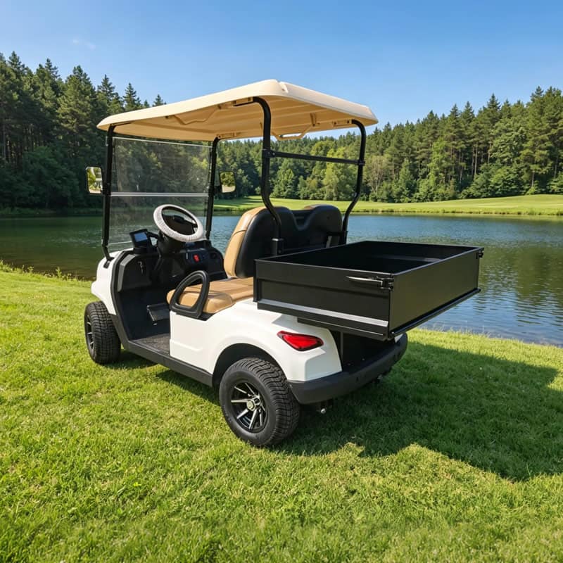 Le modèle EG202EH de Mobilité Plus combine confort passager et capacité de transport grâce à sa benne arrière intégrée. Idéale pour les golfs, campings, parcs, entrepôts, ou tout site privatif nécessitant un véhicule électrique utilitaire compact, cette golfette à benne répond aux exigences les plus élevées en matière de performance et de fiabilité.
