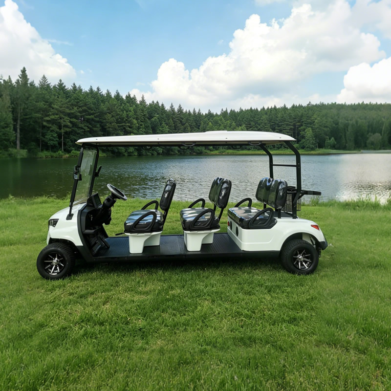 Découvrez la Golfette Eagle 6 places, le grand format de nos voiturettes de golf électriques professionnelles, conçu pour les sites à fort trafic passagers.